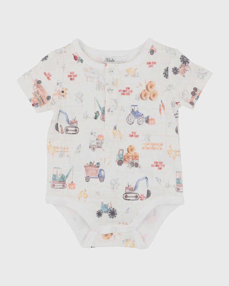 Bring a touch of countryside charm to their everyday wardrobe with our Clayton Henley Bodysuit, crafted in 100% organic cotton for softness and breathability. This sweet little piece features a delightful farm-themed print, showcasing animals, hay bales and tractors, perfect for curious little adventurers. The henley-style button placket and press stud crotch opening make dressing and changing a breeze.