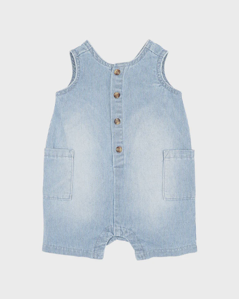 This relaxed denim-look romper is a farmyard favourite, perfect for exploring paddocks, playdates or lazy weekend strolls. Made from soft, breathable cotton with a gentle stripe wash and faded finish, it's an effortless all-in-one that combines practicality with charm.
