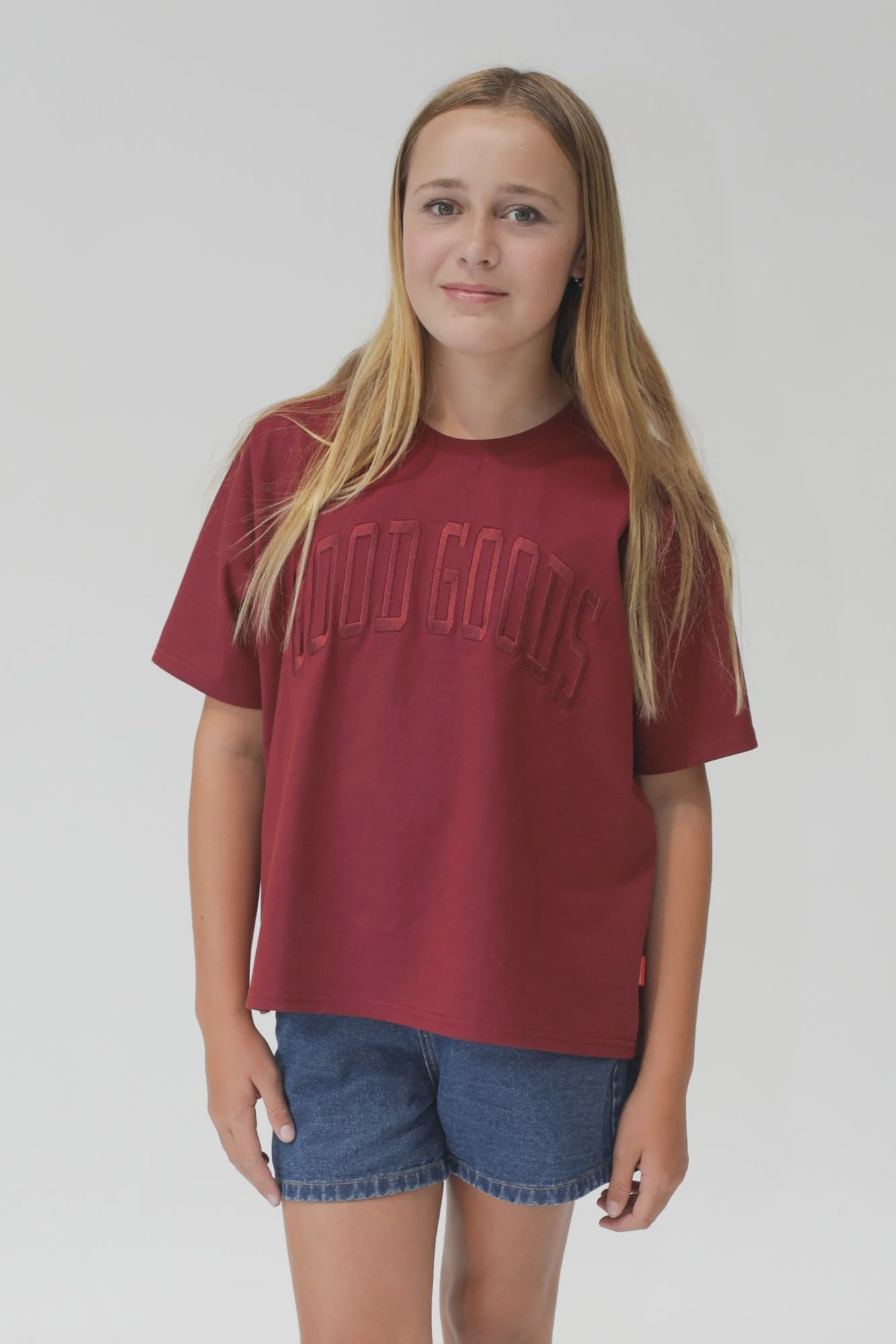 The Good Goods Fia Tee in rich Ruby is crafted from a premium 95% cotton / 5% Lycra single jersey knit, giving it a soft hand feel with just the right amount of stretch. This new boxy silhouette offers a more relaxed fit, finished with tonal chest embroidery and our signature woven label at the hem.