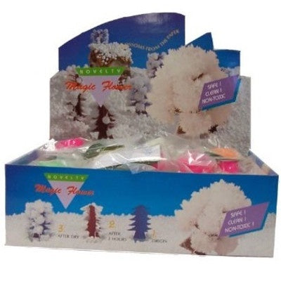 The magic trees consist of a sachet of crystal solution and a cardboard tree. The tree soaks up the liquid, then as it evaporates crystals are deposited all over the tree.