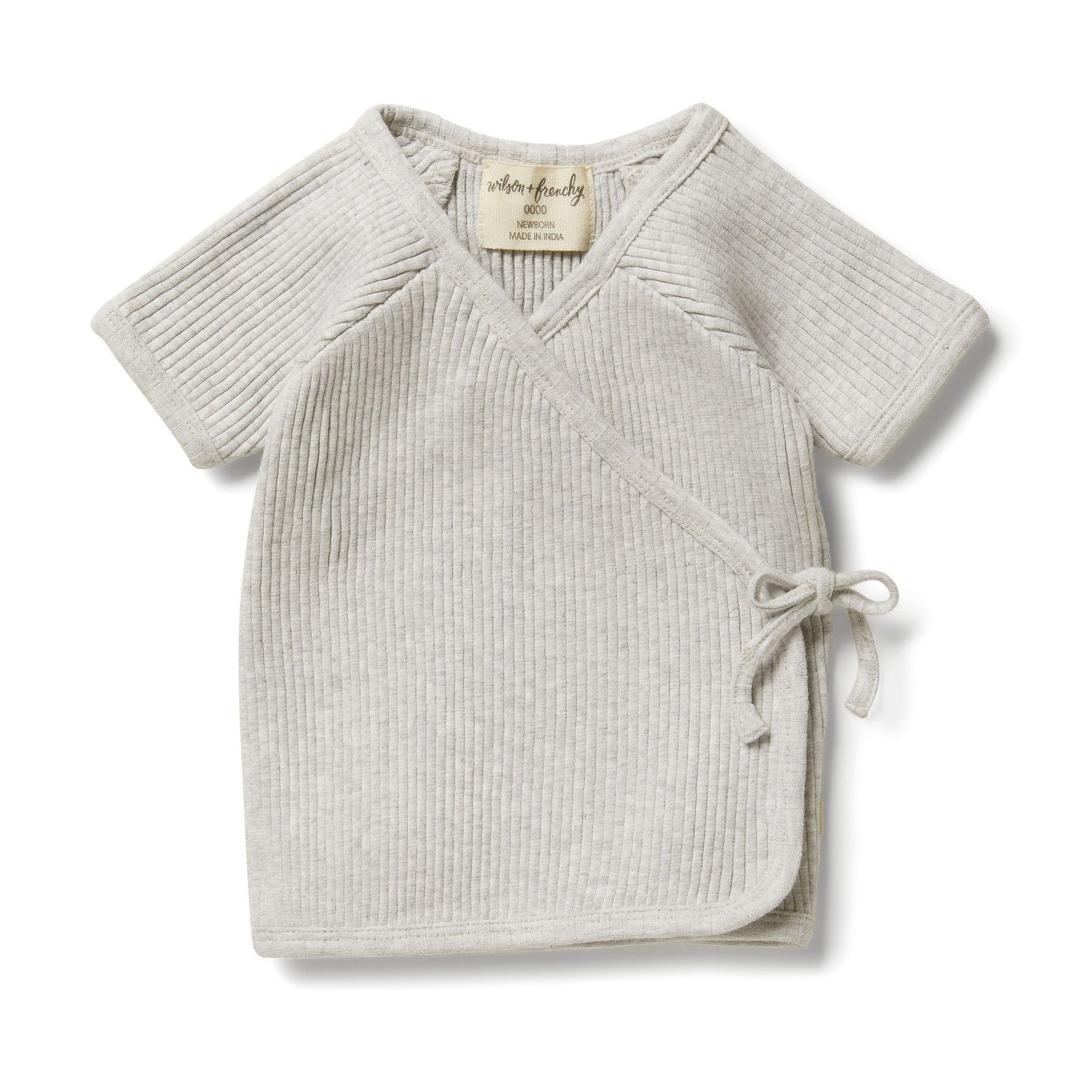 Snug fiiting, this short sleeve 7x1 rib kimono wrap cardigan features a cross over snap opening for easy dressing. 95% organic cotton 5% elastane. Made in India. GOTS certified. Machine washable.